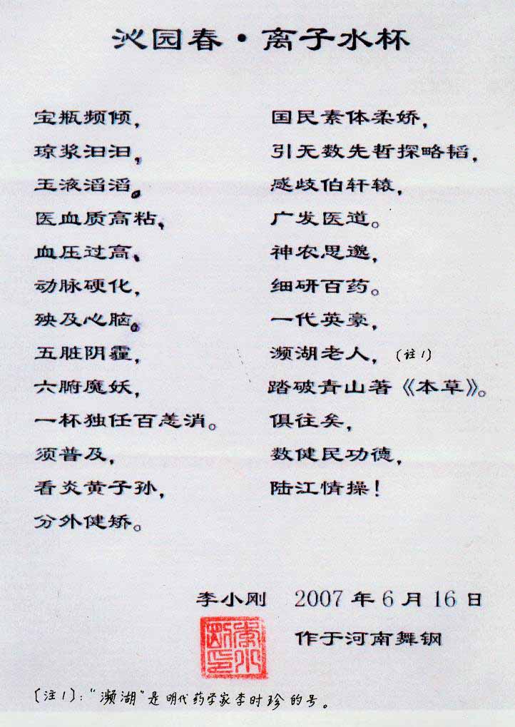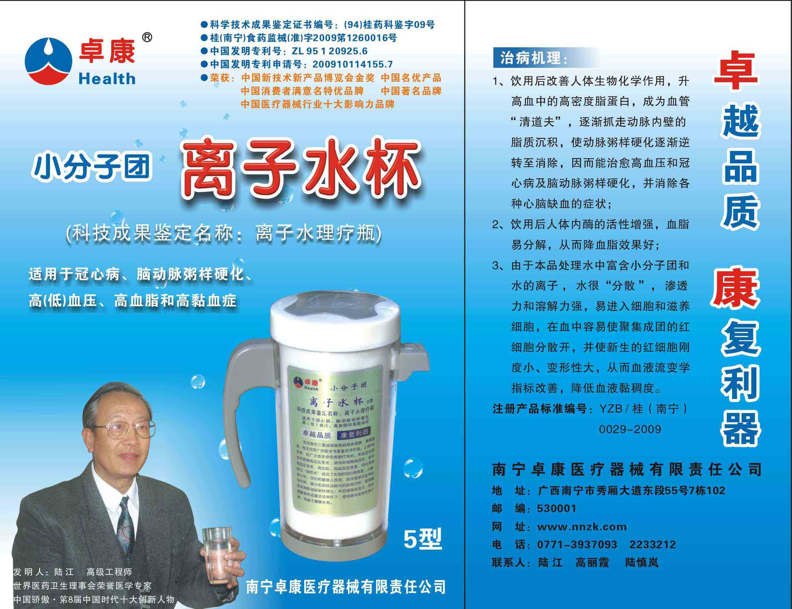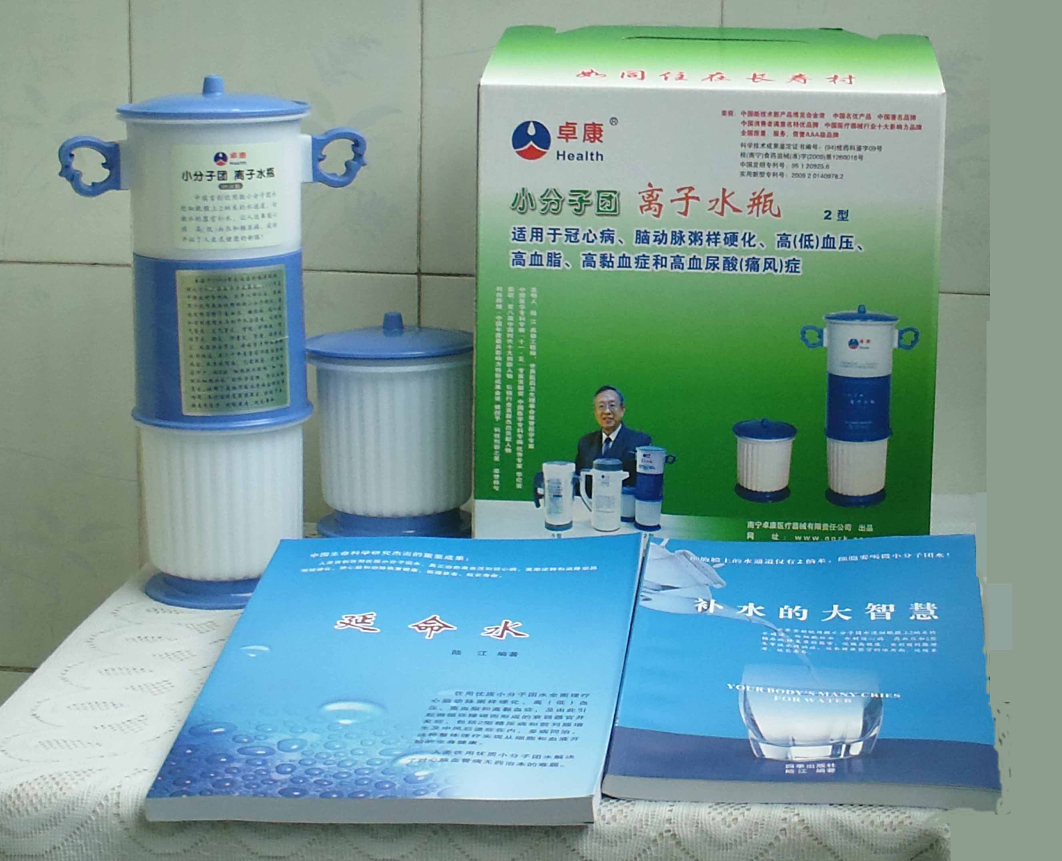 -----我是從事建筑的高工,本來沒有資格去攻克醫(yī)學(xué)難題,卻為了自身健康才扣響醫(yī)學(xué)的大門。由于我1990年患高血壓,因怕中風(fēng)才研究發(fā)明了離子水瓶,我把水處理成微小分子團(tuán)水,飲用后治愈了高血壓。便于1993年底送到三家省級(jí)醫(yī)院做臨床試用4個(gè)月。經(jīng)北京和廣西醫(yī)學(xué)專家鑒定:"降脂降壓效果好"," 能擴(kuò)大心腦動(dòng)脈流量,改善心腦電圖以及微循環(huán)","對治療心腦動(dòng)脈粥樣硬化、高血壓、高血脂有良好的醫(yī)療保健作用。""產(chǎn)品的技術(shù)性能和療效達(dá)到了同類產(chǎn)品的國內(nèi)領(lǐng)先水平,經(jīng)廣西醫(yī)學(xué)科學(xué)情報(bào)研究所檢索,未見國外有類似報(bào)道。"中國醫(yī)學(xué)科學(xué)院張正國教授從美國國立醫(yī)學(xué)圖書館數(shù)據(jù)庫存Medline檢索英俄文資料,均未見類似報(bào)告。2000年上市后,我為了對消費(fèi)者負(fù)責(zé)而繼續(xù)觀察研究,一直通過《信譽(yù)卡》和《質(zhì)量跟蹤調(diào)查書》向患者承諾療效,請用戶使用6個(gè)月后反饋效果。和脂壓患者飲用2至5個(gè)月內(nèi),消除癥狀,停服藥物,血壓正常;冠心病患者飲用3~5個(gè)月逐漸減輕至消除心絞痛、房顫等癥狀,不再服藥,飲用1年左右心電圖正常,經(jīng)冠脈造影掃描無明顯狹窄,表明冠心病痊愈。大量患者還反映許多衰弱器官被修復(fù),讓前列腺增生、慢性咽喉炎、慢性氣管炎、支氣管炎、慢性胃炎、腸炎和膽囊炎等不藥而愈;2型糖尿病患者是因?yàn)橐葝u衰弱致病,飲用該水半年至一年,逐漸減藥至停藥,血糖尿糖正常,真正治愈2型糖尿病。中風(fēng)后遺癥患者飲用六七個(gè)月,可逐漸減輕至消除肢體和語言障礙,表明飲用該水能讓壽命很長的神經(jīng)元細(xì)胞逐漸修復(fù),奇跡般地恢復(fù)肢體和語言功能。飲用后還使胸腺和脾臟兩個(gè)重要的免疫器官被修復(fù)和增強(qiáng),產(chǎn)生免疫細(xì)胞多,提高了免疫力,使人不生病或少生病。自此, 飲用微小分子團(tuán)水創(chuàng)造了攻克冠心病、高(低)血壓和糖尿病三大醫(yī)學(xué)難題的奇跡。人們對此感到不可思議,但實(shí)踐是檢驗(yàn)真理的唯一標(biāo)準(zhǔn)。
