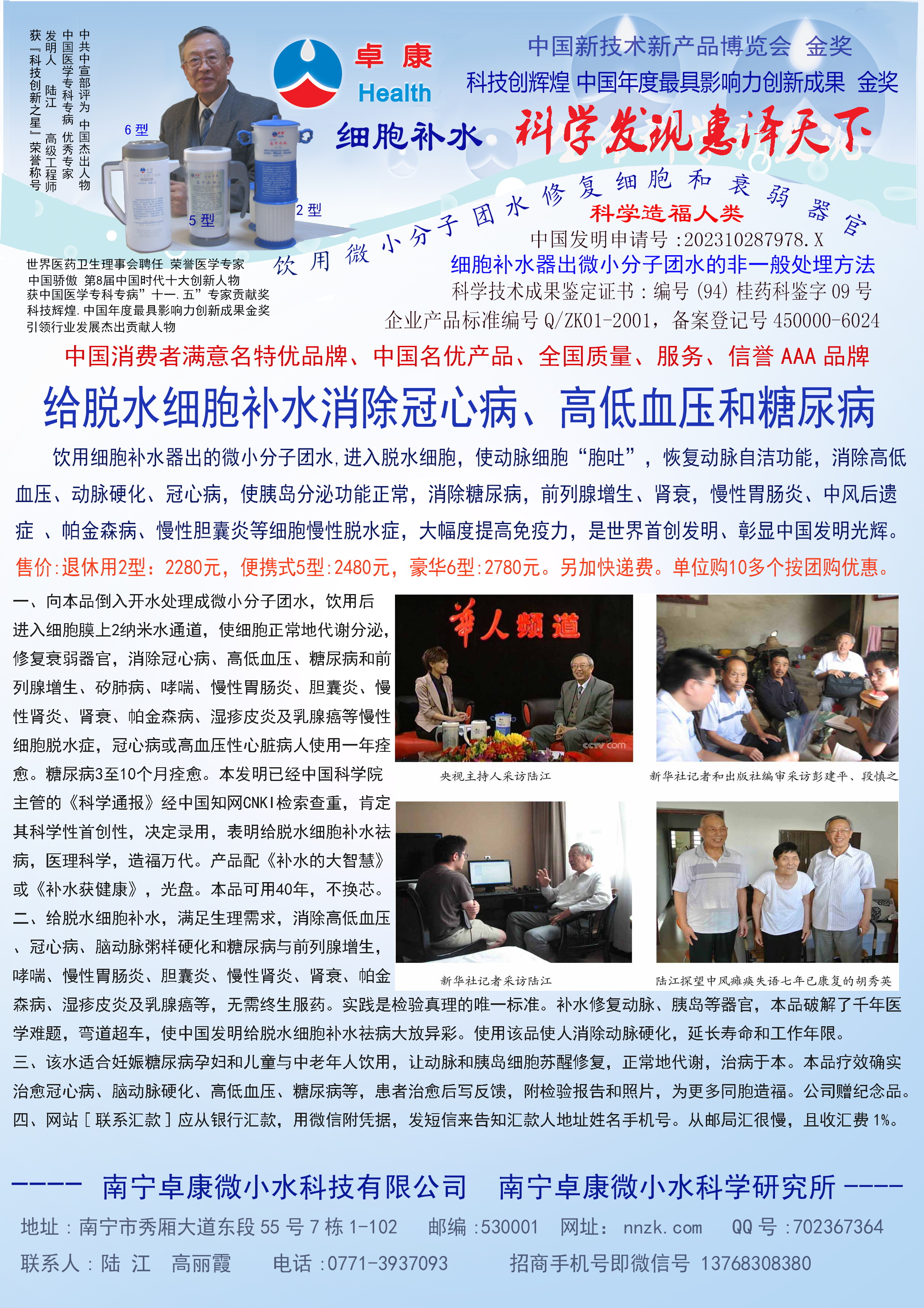 人類幾千年來患以上病癥需終生服藥,幾十年也不能治愈。可是我國南寧的高級(jí)工程師陸 江,于1990年想根治高血壓,研究發(fā)明了離子水瓶,處理出微小分子團(tuán)水供飲用,經(jīng)過醫(yī)院臨床試用和專家鑒定,1999年獲中國發(fā)明專利權(quán),產(chǎn)品于2000年投放市場后一直跟蹤調(diào)查,據(jù)全國各地用戶反饋:祛除了高低血壓、糖尿病和冠心病,并使前列腺增生、咽喉炎、鼻竇炎、慢性氣管炎、支氣管炎、矽肺病、哮喘、慢性胃炎、腸炎、慢性膽囊炎、慢性腎炎、腎衰、膀胱炎、便秘、痔瘡、風(fēng)濕性關(guān)節(jié)炎和濕疹皮炎及中風(fēng)后遺癥等病癥不藥而愈。為什么喝微小水能治20多種病?陸 江從1991年德國科學(xué)家發(fā)現(xiàn)細(xì)胞膜水通道僅為2納米獲得啟發(fā),認(rèn)為多種器官患病是因細(xì)胞脫水,不能正常代謝和分裂增殖,才使器官細(xì)胞減少致衰弱萎縮而形成細(xì)胞缺水性病癥。22年來的實(shí)踐有力地支持了“細(xì)胞脫水致病”這一重要論點(diǎn),表明喝微小水可滿足細(xì)胞的生理需求,補(bǔ)水就能祛病,是生命科學(xué)新亮點(diǎn)。